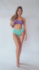 Il se compose d’un soutien-gorge brassière en dentelle violette avec des bonnets à armatures assurant le meilleur maintien, et d’un shorty turquoise en dentelle volantée.