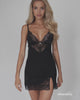 Der V-Ausschnitt zieht sofort die Blicke auf sich; seine Intensität ist darauf ausgelegt, die Aufmerksamkeit zu fesseln. Die Kanten sind mit Spitze eingefasst, die sich auch am Saum des Nachthemdes wiederfindet.
